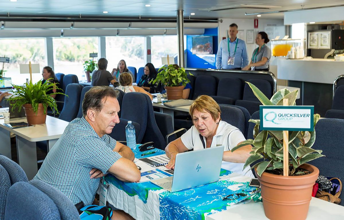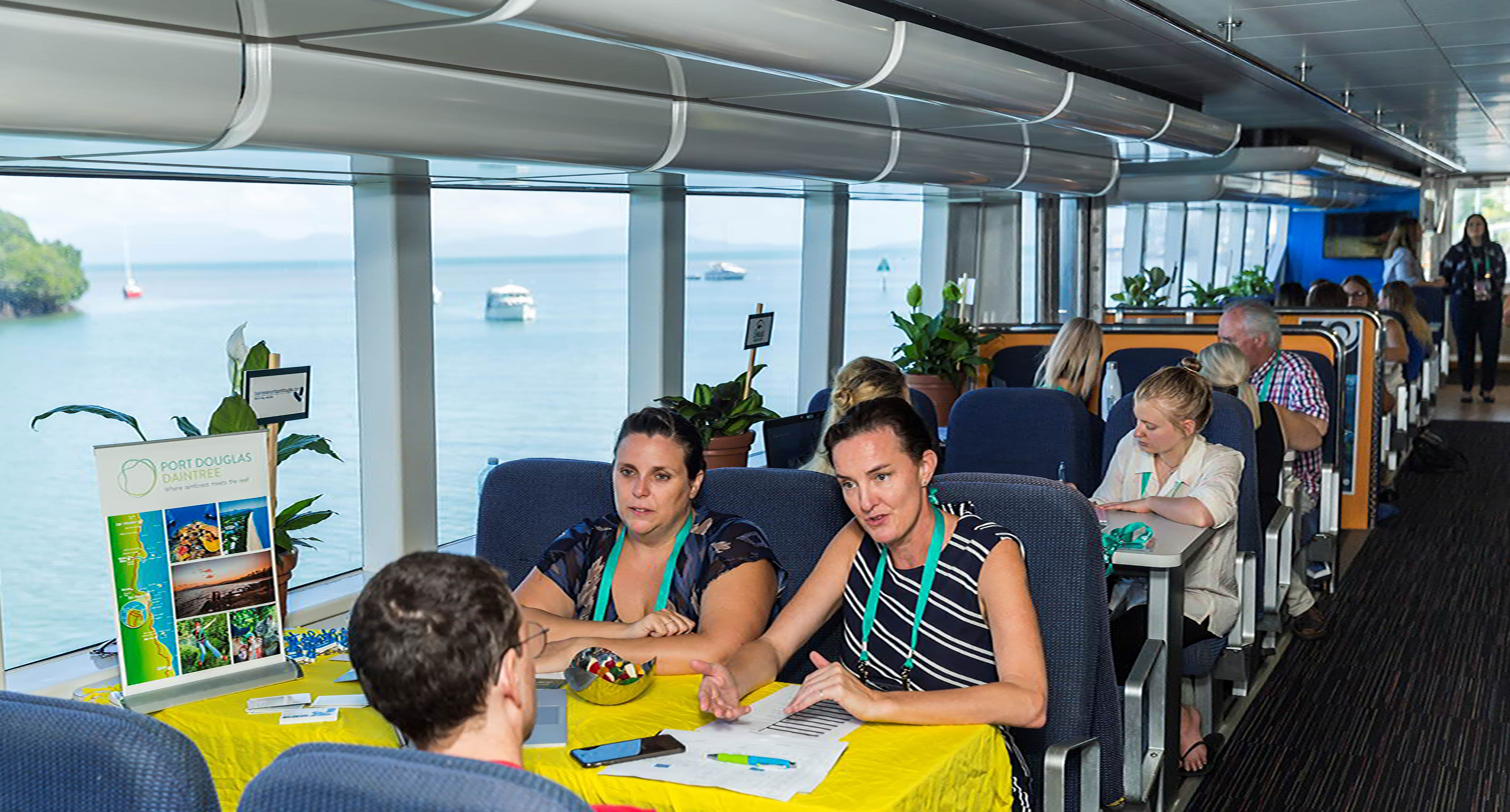 The spotlight was on Port Douglas and the Daintree when around 70 business event planners from Australia and New Zealand attended this year’s annual Sell TNQ event hosted by TTNQ’s BEC – Business Events Cairns & Great Barrier Reef. We were delighted to provide the unique venue for the full day tradeshow onboard our flagship wavepiercer Quicksilver VIII with the marina and stunning Daintree backdrop.