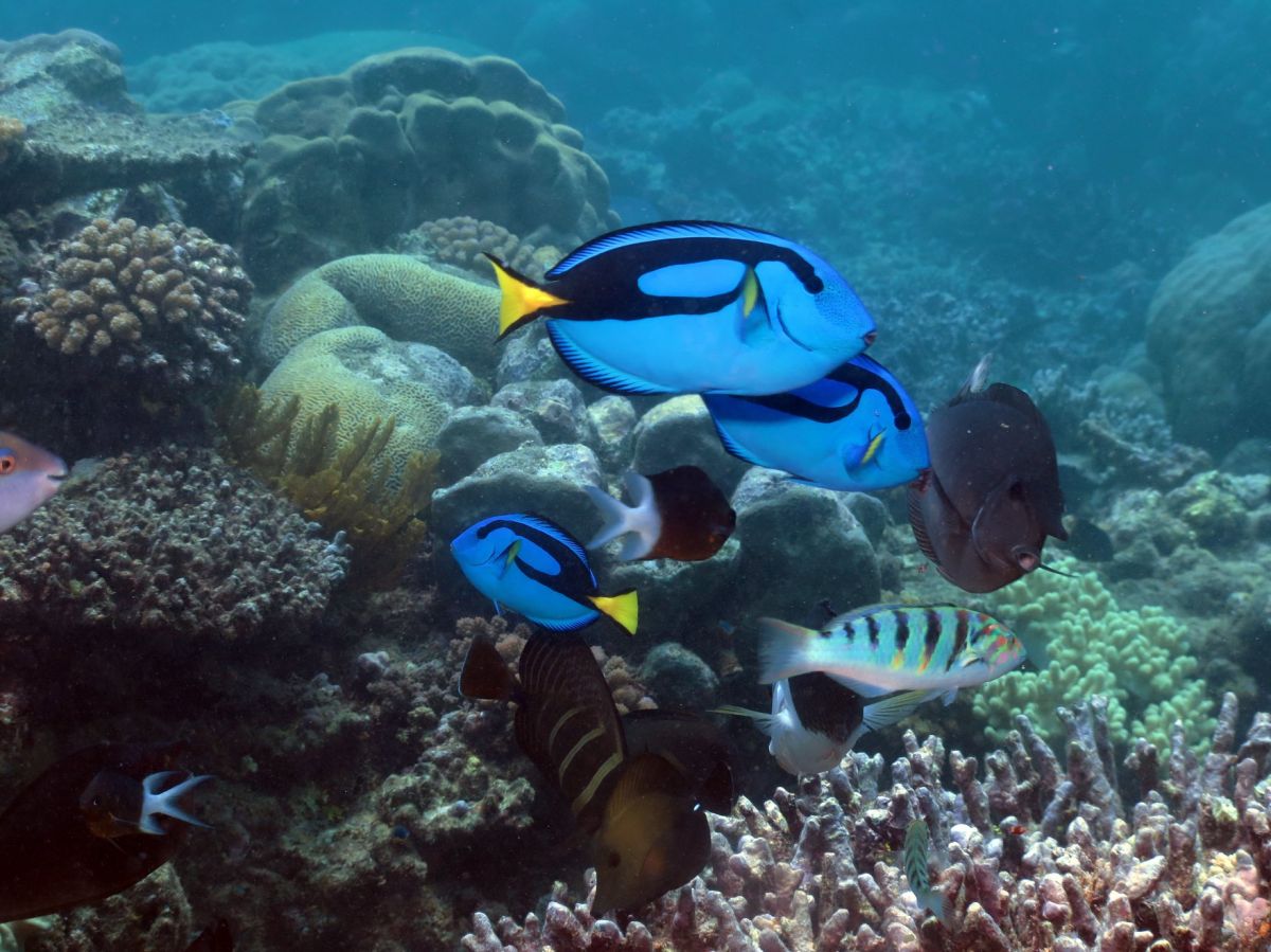 Their body is basically flat and oval in shape with a small mouth for grazing on algae. They have very distinctive colours. When snorkelling or diving, look for a vibrant electric blue body with bold black markings and a yellow tail. They usually live in pairs or in small groups. Blue tangs are generally found on the seaward edge of coral reefs as they prefer high current areas.